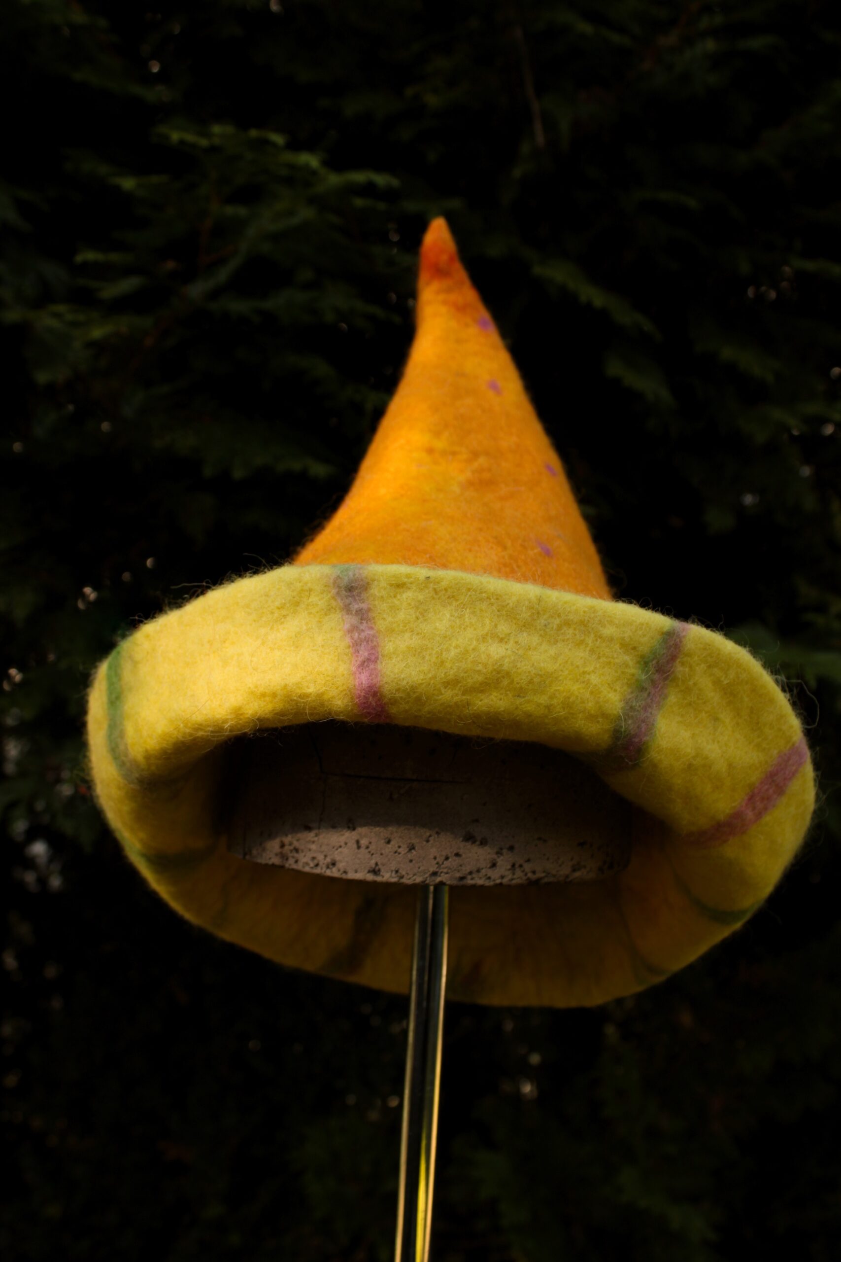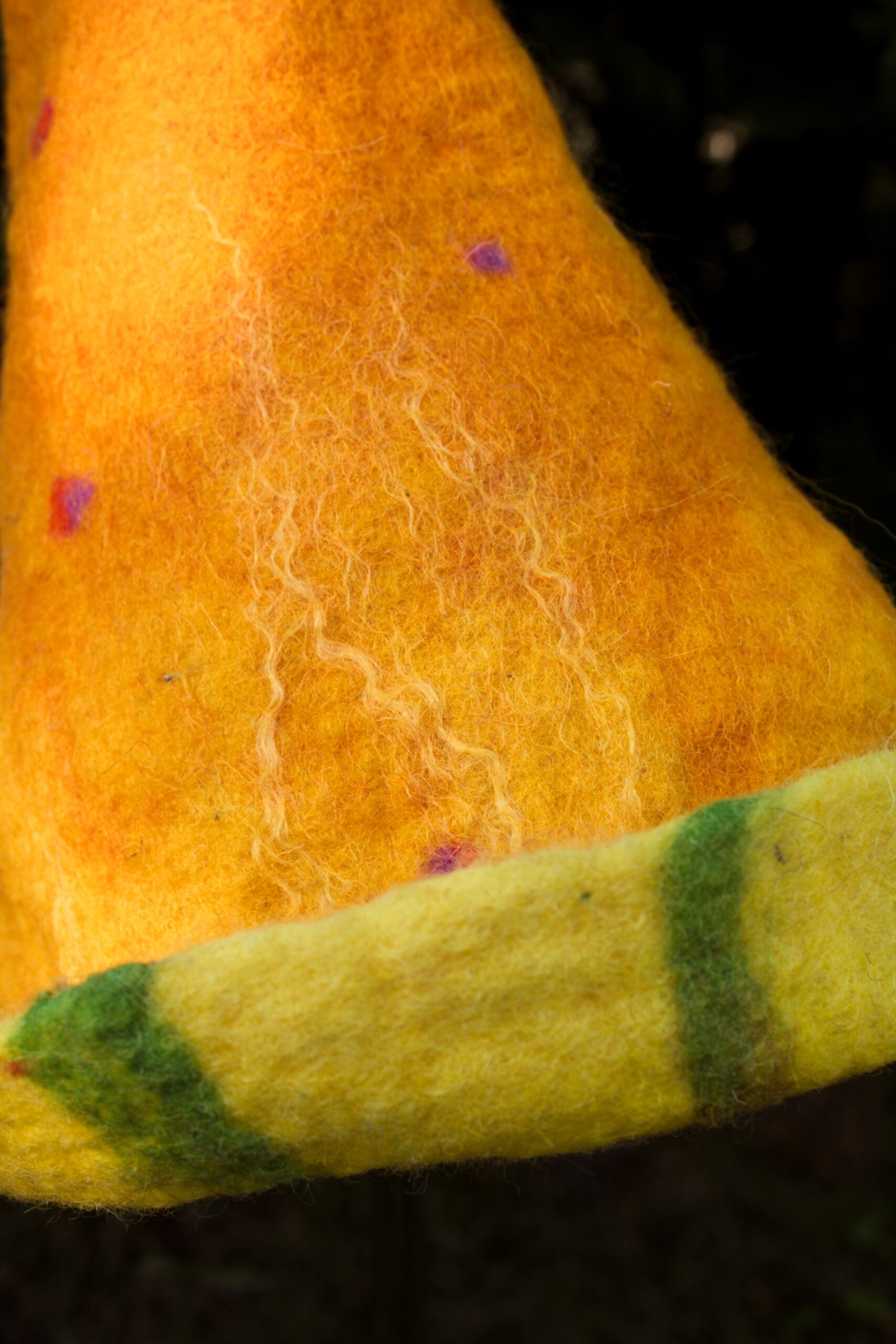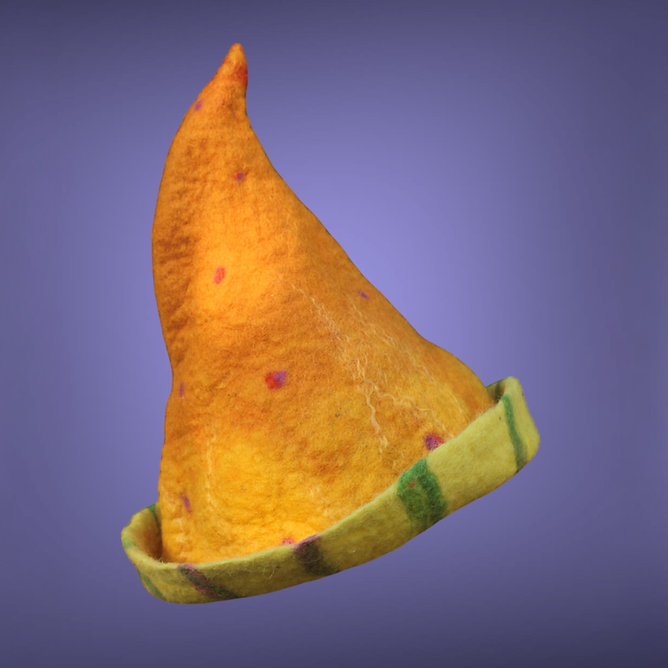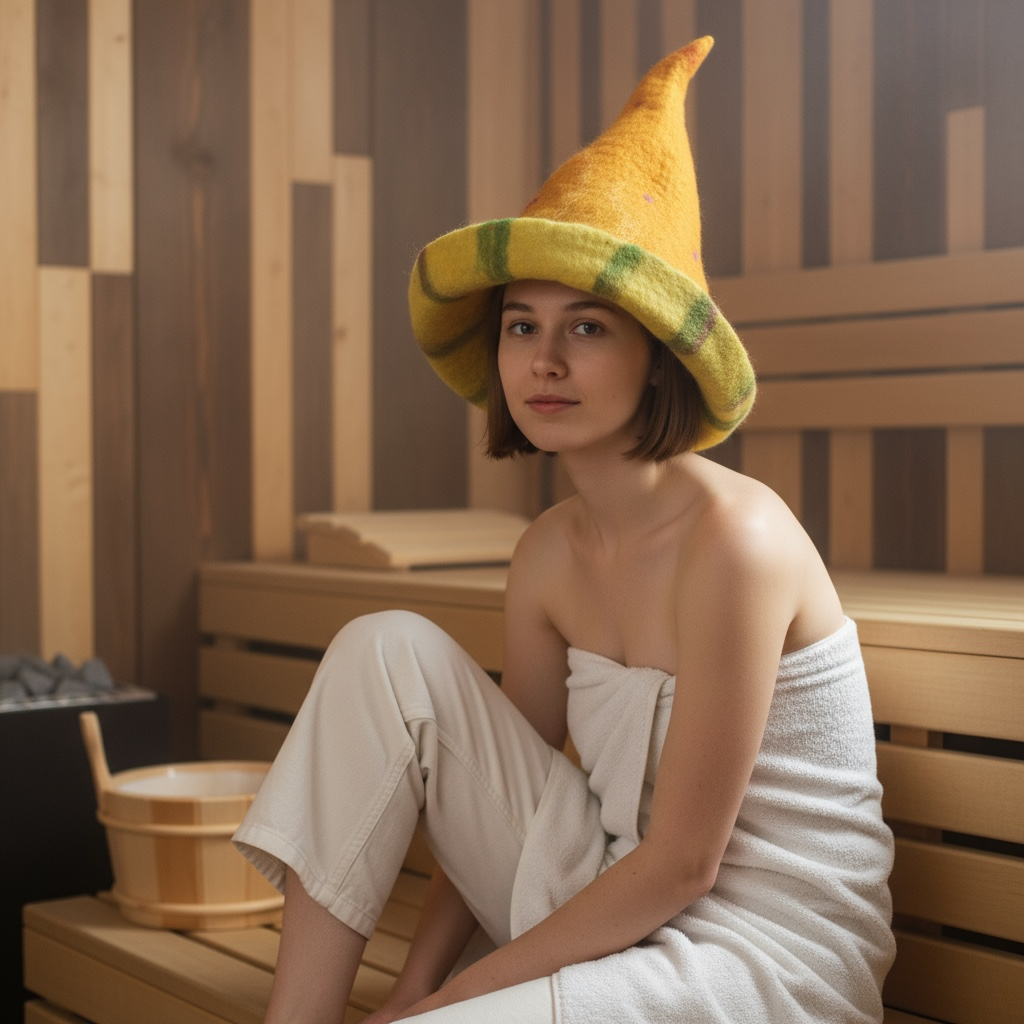 Czapka do sauny ręcznie filcowana z włókien wielu owiec – merynosa, blue face leicester oraz alpejskiej wełny owczej. Skrzy się w słońcu i w półmroku.